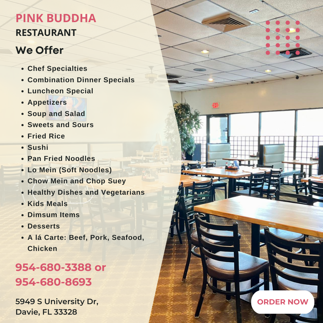 Welcome to Pink Buddha Restaurant, a hidden gem nestled in Davie, FL. This establishment offers a diverse menu that beautifully marries tradition with modern flair, ensuring a delightful experience for every palate. The dim sum selections, like the Deep Fried Shrimp Dumplings and Scallion Pancake, are must-tries, perfectly exemplifying the vibrant flavors and textures of Asian cuisine.
